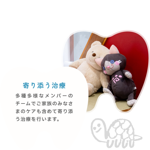 歯科医師だけでなく、形成外科医師等、多職種の専門家が連携してチームとなり、ご家族のケアも含めた寄り添う治療を行っております。新生児期から青年期まで長期にわたる治療を、患者さまの成長に合わせてサポートいたします。