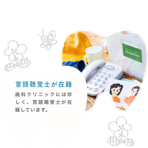 学会で最優秀論文賞を受賞した言語聴覚士監修・指導のもと、言語発達促進や正しい発音習得のための構音訓練、唇裂口蓋裂手術後・口腔がん手術後の機能訓練、その他発達検査など、お一人おひとりに合わせてサポートいたします。