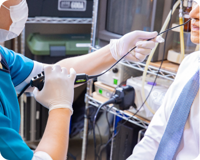 鼻から小型カメラを挿入してのどの動きを検査します。