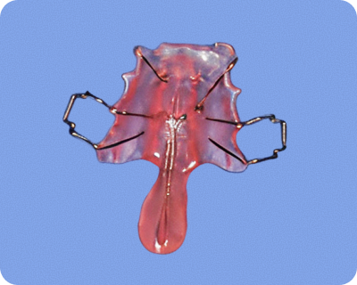 上あごの柔らかい部分を持ち上げ、発話時の空気が鼻から漏れるのを防ぐ装置で、装着することで話し言葉の明瞭度が上がります。